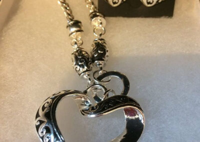 Some of our local jewelry is made from antique buttons & pins which have been hand sewn. Very unique. Locally made silver spoon/fork rings, pins, necklaces, bracelets and watches are always popular.